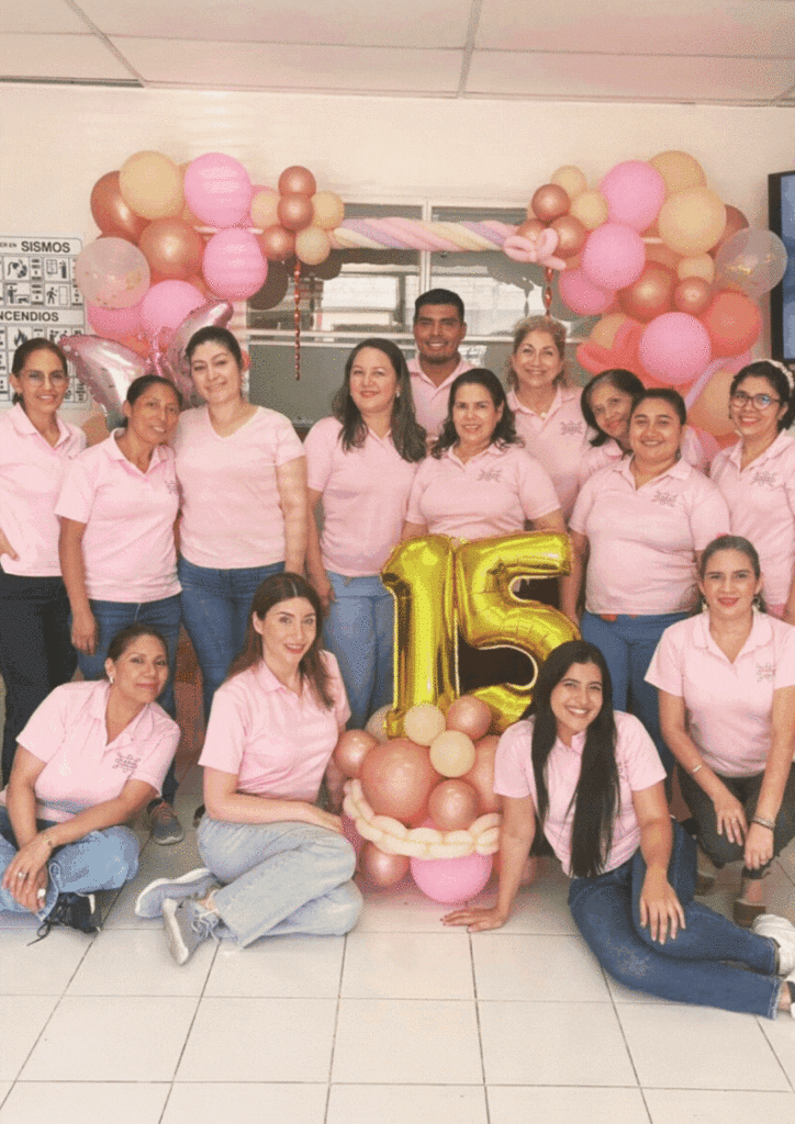 The clinic was adorned in beautiful pink and gold. A special highlight came from Irma Soza, a beloved wound-care patient who first came to us during our very first vascular mission. Irma lovingly donated the cakes for this celebration and continues to give back with warmth and generosity.